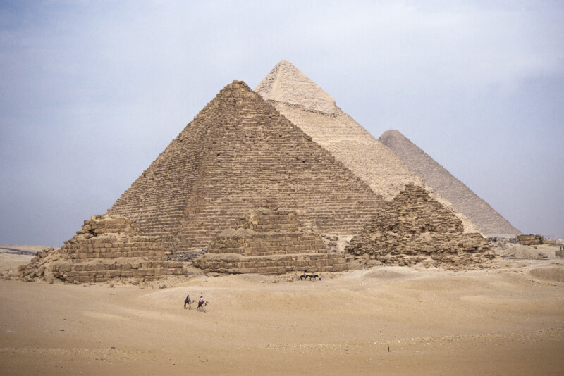 The next two kings of the dynasty, Khafre (Gk. Cephren) and Menkaure (Gk. Mycerinus), built their pyramids back on the Giza plateau. Khafre’s pyramid is nearly as high as Khufu’s, but has a steeper angle, so fewer stones were required.