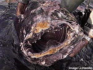 and lying on the ocean floor, which are 3-4 ft. long. The fishermen report