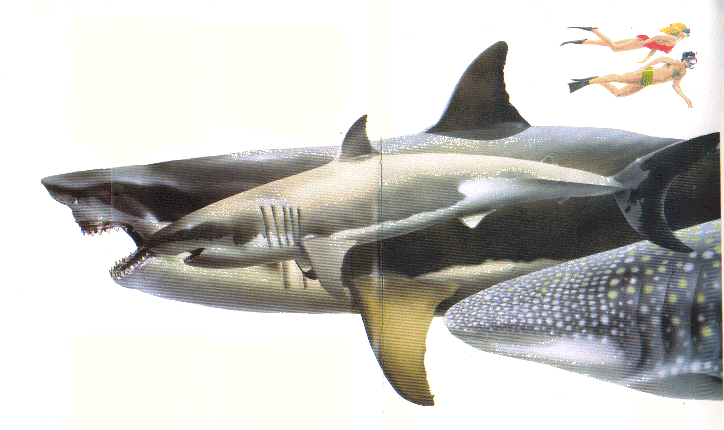 [A megalodon, or giant white shark, swimming behind a great white and basking shark; drawing taken from "Giants" by David Peters]